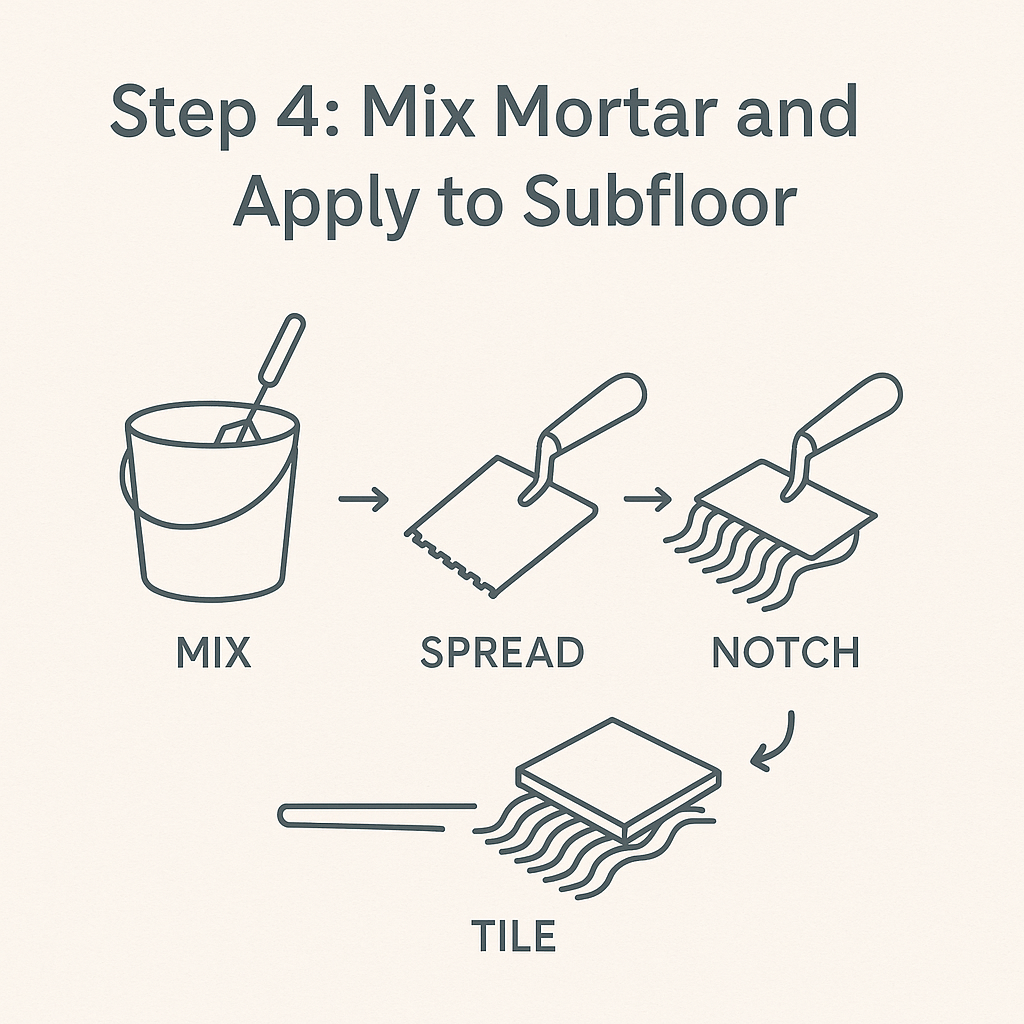 First, mix the thinset mortar as the maker says. Use a clean bucket and a drill with a mixing paddle to make it smooth and without lumps. Let it sit for a few minutes, then mix again before you use it.