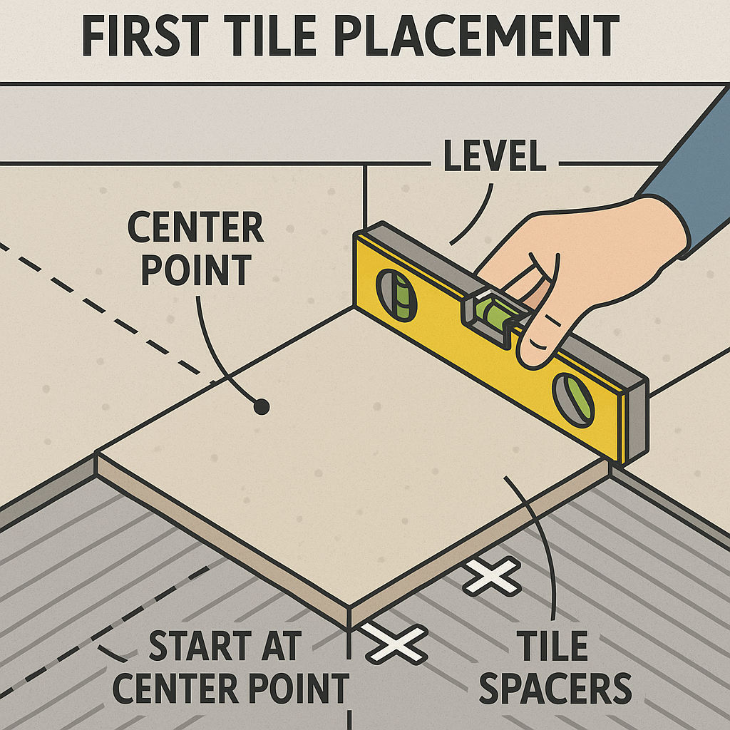 After setting the first tiles, keep placing the rest in rows. Start from your first spot, placing each tile with spacers to keep grout lines even. Check often to ensure tiles are level and adjust if needed to avoid bumps.