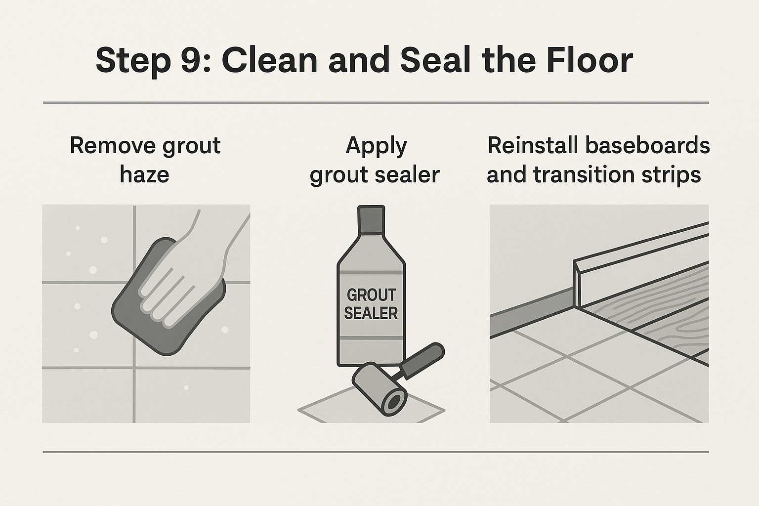 After cleaning and drying, put back your baseboards and add any needed strips between different floors or rooms. This makes your tile floor look neat and finished.